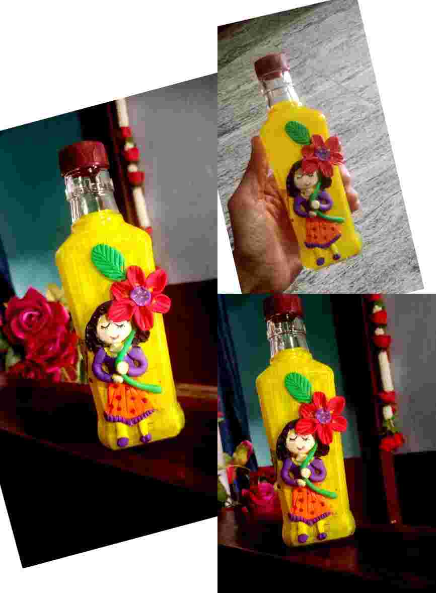 ವೇಸ್ಟ್ ಆಗಿರೋ ಗಾಜಿನ ಬಾಟಲಿಯನ್ನು ಕಲರ್ ಕ್ಲೇ ಬಳಸಿ ಅಲಂಕಾರಿಕ ವಸ್ತುವಾಗಿ ಬಳಸಿಕೊಂಡಿದ್ದು.